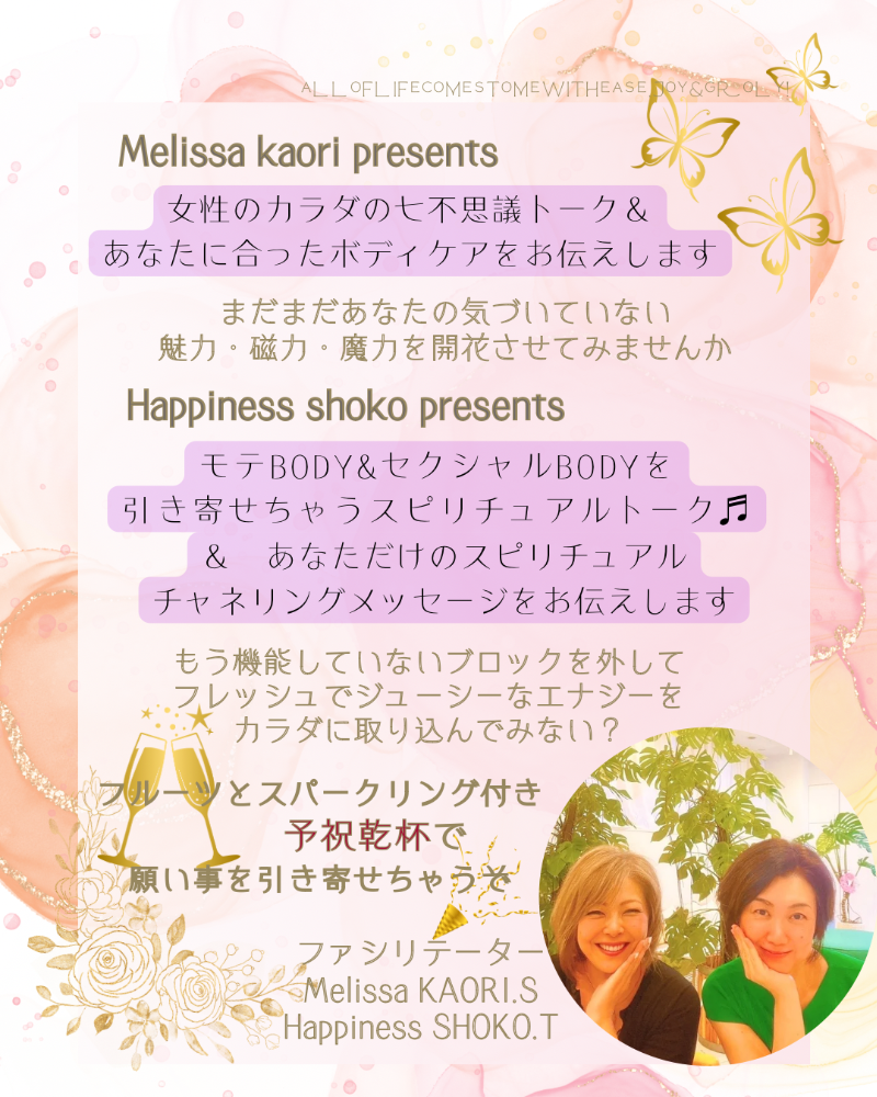 🦋自分自身の魅力に気づきたい方🦋あなたの可愛いに気づきたい方🦋不要なハートのブロックを外したい方🦋視えない存在🧚からのメッセージを受け取りたい方🦋パートナーを探している方🦋フレッシュでジューシーなエネルギーをカラダに取り込みたい方🦋ステキな笑顔になりたい方🦋艶っぽくなりたい方🦋私たちに会いたい方💕お待ちしておりますお席に限りがございますご予約はお早めに♡